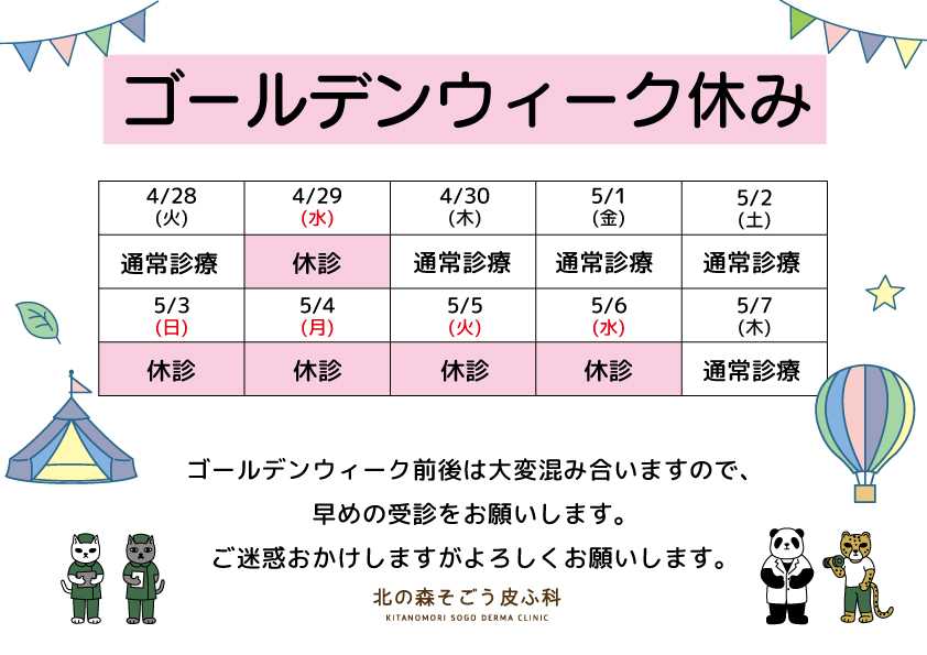 ゴールデンウィークは暦通りです 公開日:2026年4月6日 お知らせ ゴールデンウィークは暦通りとなります。ゴールデンウィーク前後は大変混み合いますので、早めに受診をお願いします。 関連記事 9月から土曜日の受付時間が12時30分までとなりますオンライン診療(再診)火曜日の美容皮膚科について👣歩き方測定器「Ayumi」👣当院の施設基準について診療時間の変更案内 投稿ナビゲーション 4月の足と靴の相談会👞
