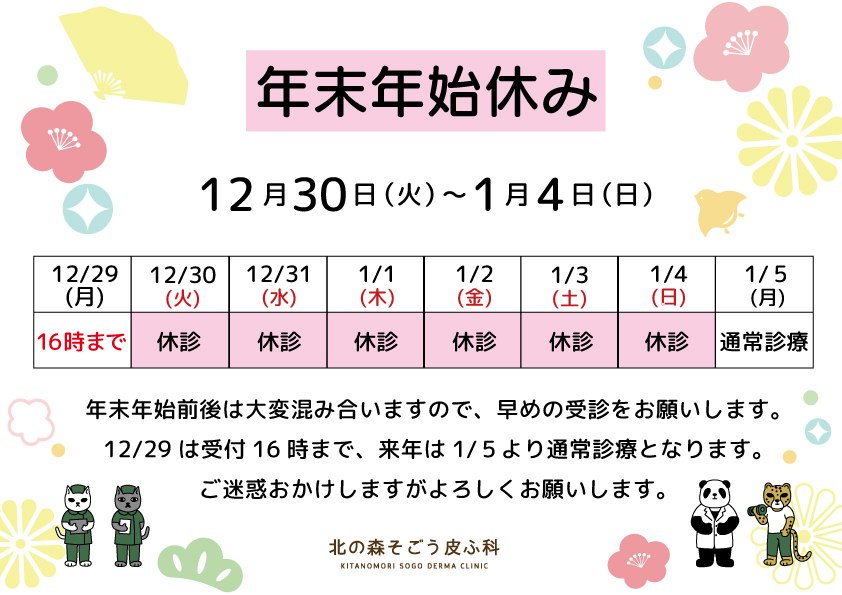 12月30日(火)から令和8年1月4日(日)まで年末年始のおやすみをいただきます。